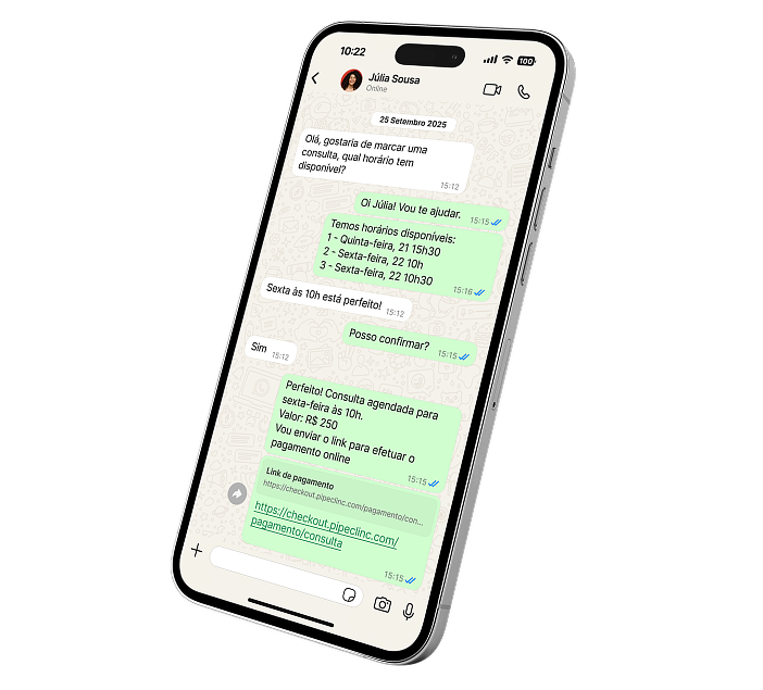 Não. A Pipe Clinic se propõe a executar de forma automática 100% de funções importantes como marcar consultas, desmarcar, criar encaixe, fazer lembretes e até cobrar. Mas, consideramos muito importante você continuar tendo um atendimento humano para acompanhar, atender em casos especiais e focar no relacionamento com seus pacientes.