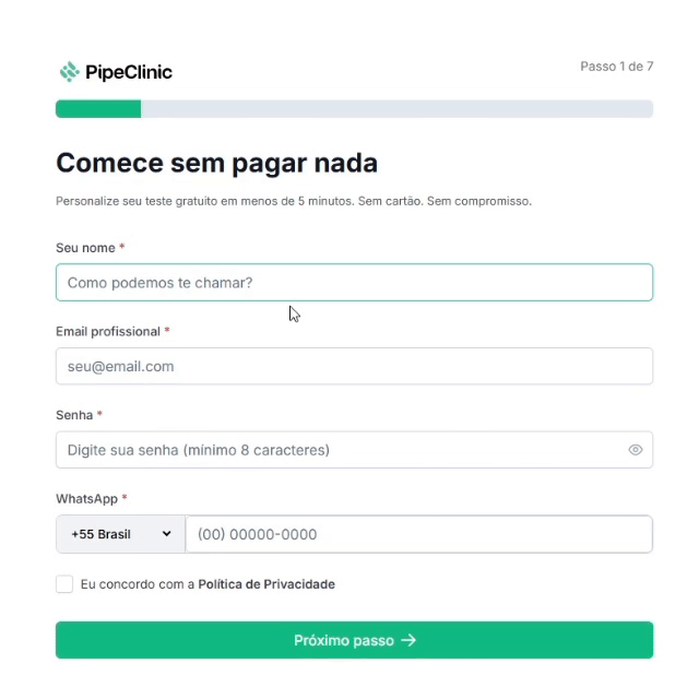 De jeito nenhum. Você define as regras, os horários, os preços e a forma de comunicação. A PipeClinic executa exatamente como você configu
